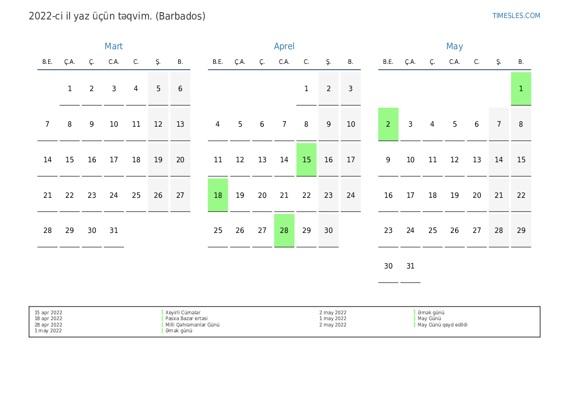 2022-ci ilin Yazda Barbadosda 10 tətil və istirahət günləri var. Bahar 2022 çərşənbə axşamı başlayır və çərşənbə axşamı günü bitir.