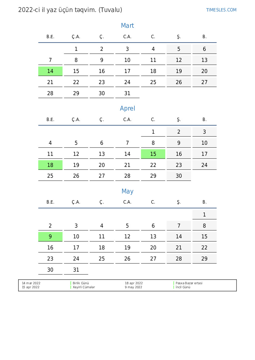Tuvalu üçün 2022-ci ilin yaz üçün tətil və həftə sonları ilə PDF təqvimini yükləyin və çap edin