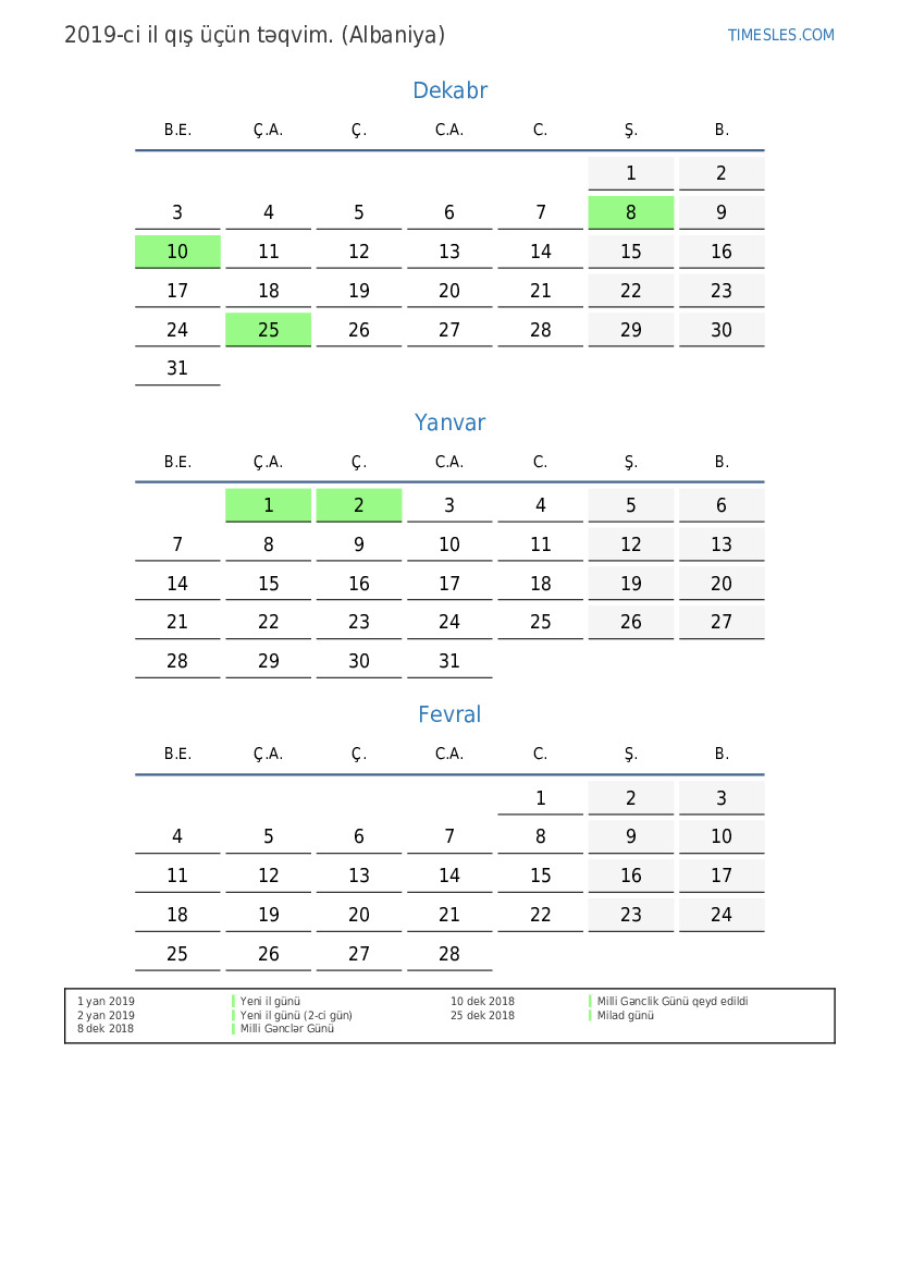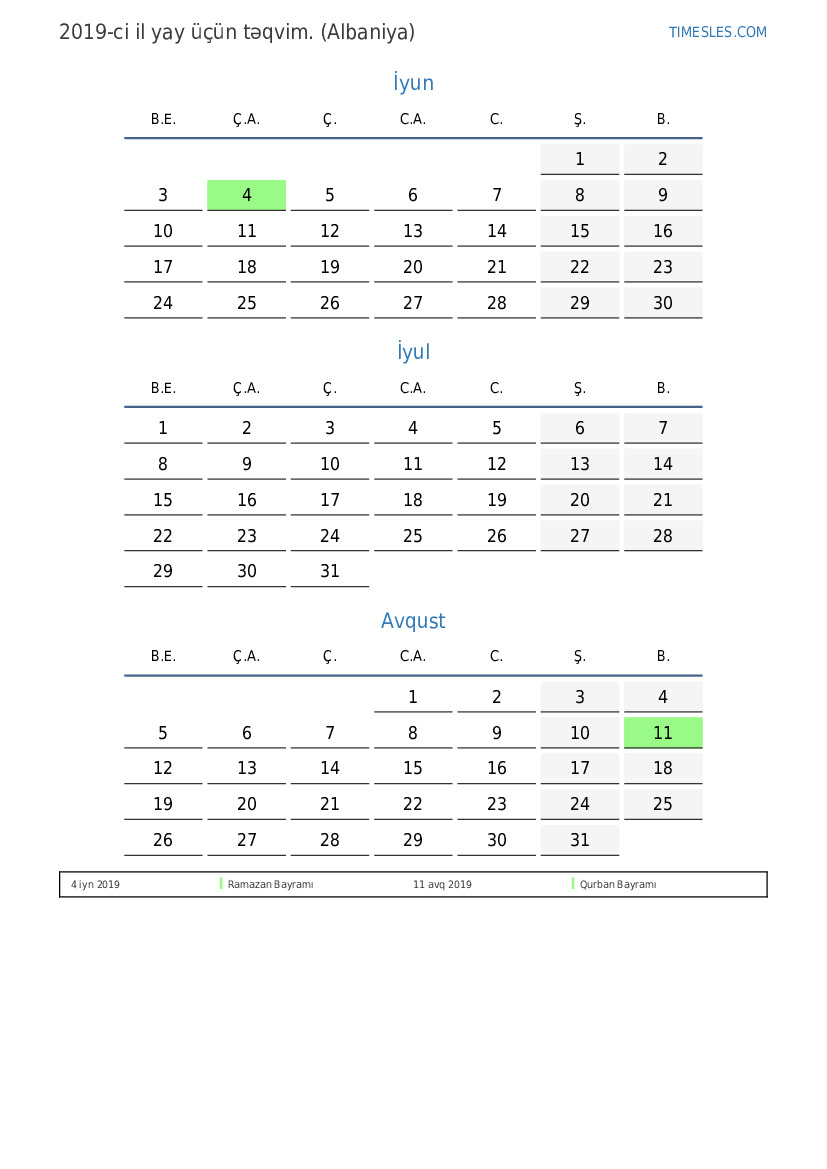 Albaniya üçün 2019-ci ilin yay üçün tətil və həftə sonları təqvimi