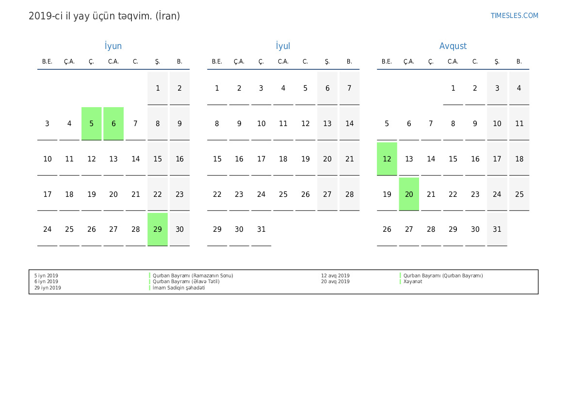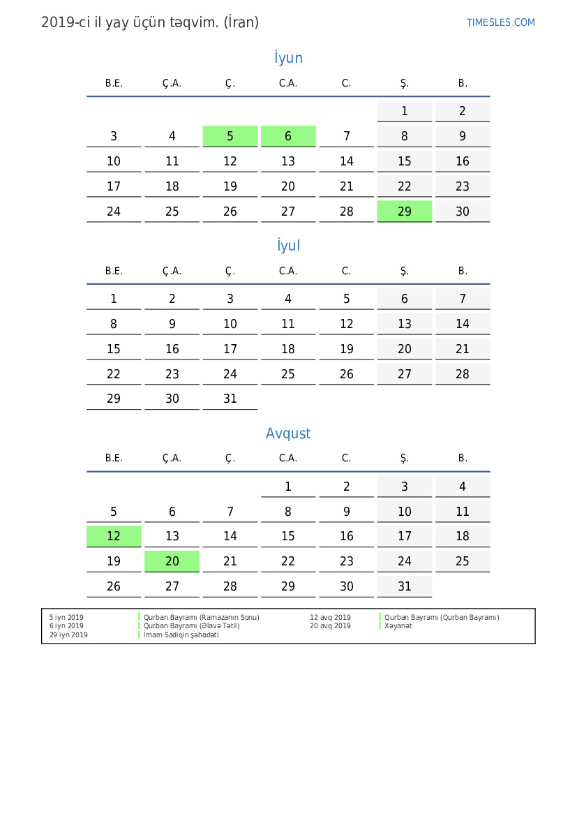 İran üçün 2019-ci ilin yay üçün tətil və həftə sonları ilə PDF təqvimini yükləyin və çap edin