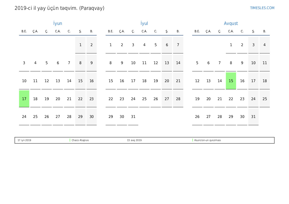 Paraqvay üçün 2019-ci ilin yay üçün tətil və həftə sonları təqvimi