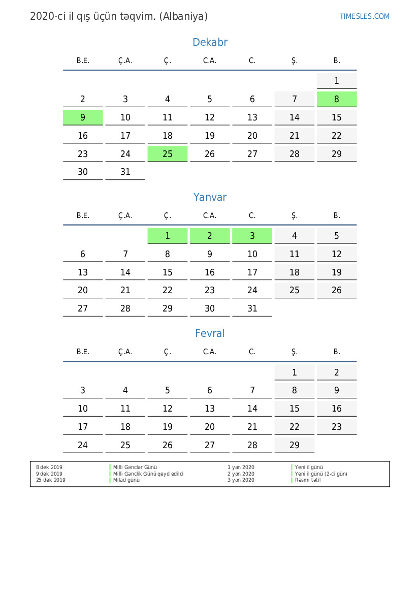 Tətillər olmadan mənzərə təqvimi