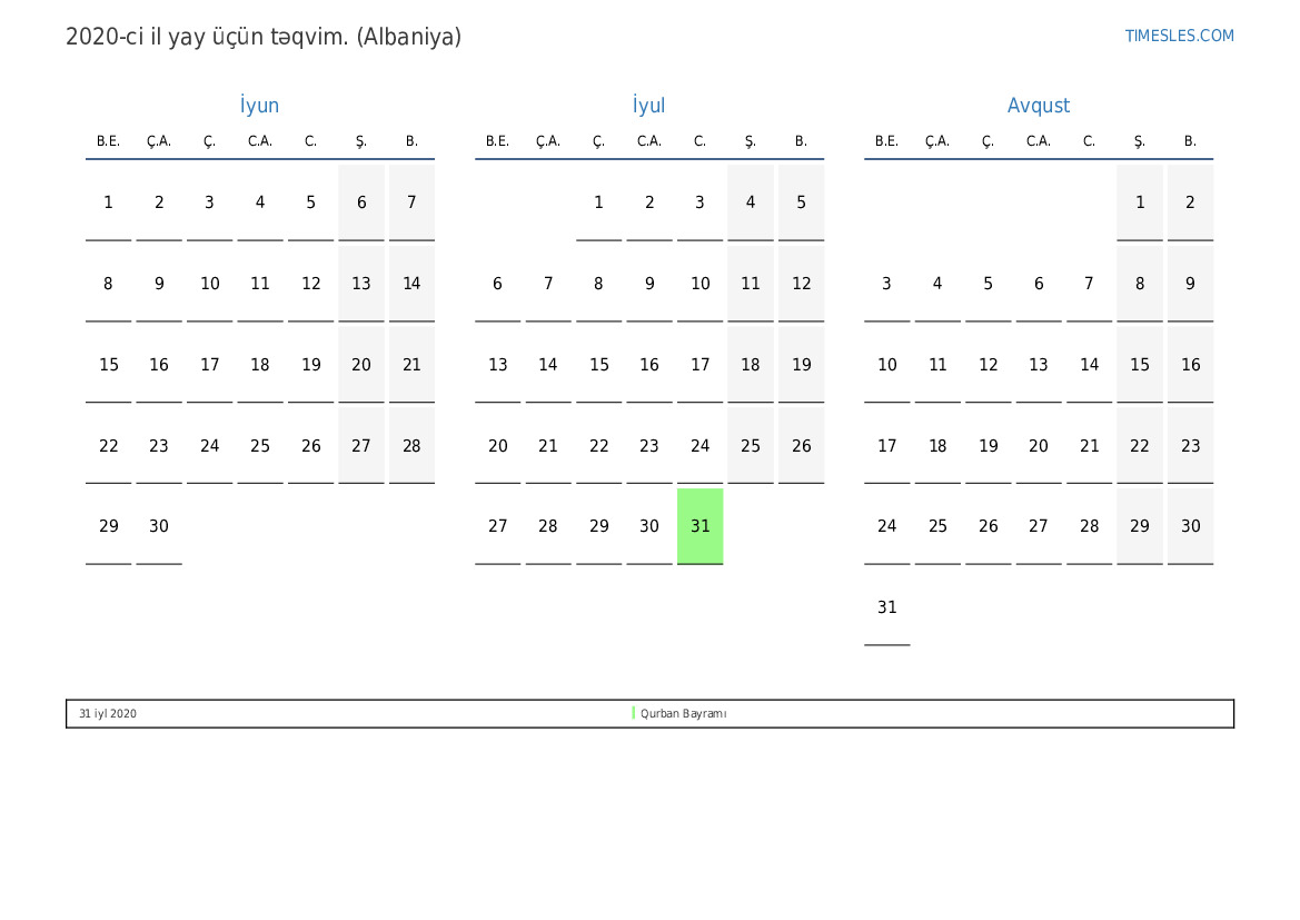 Albaniya üçün 2020-ci il yay üçün təqvim