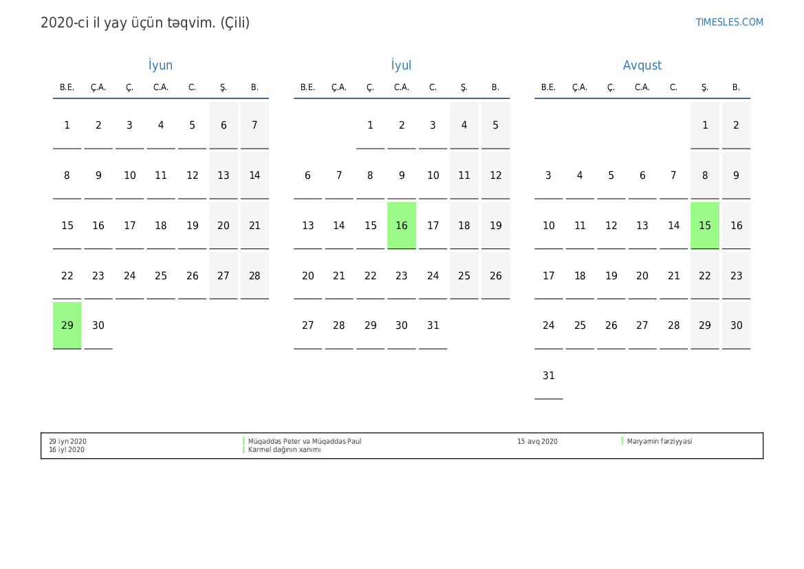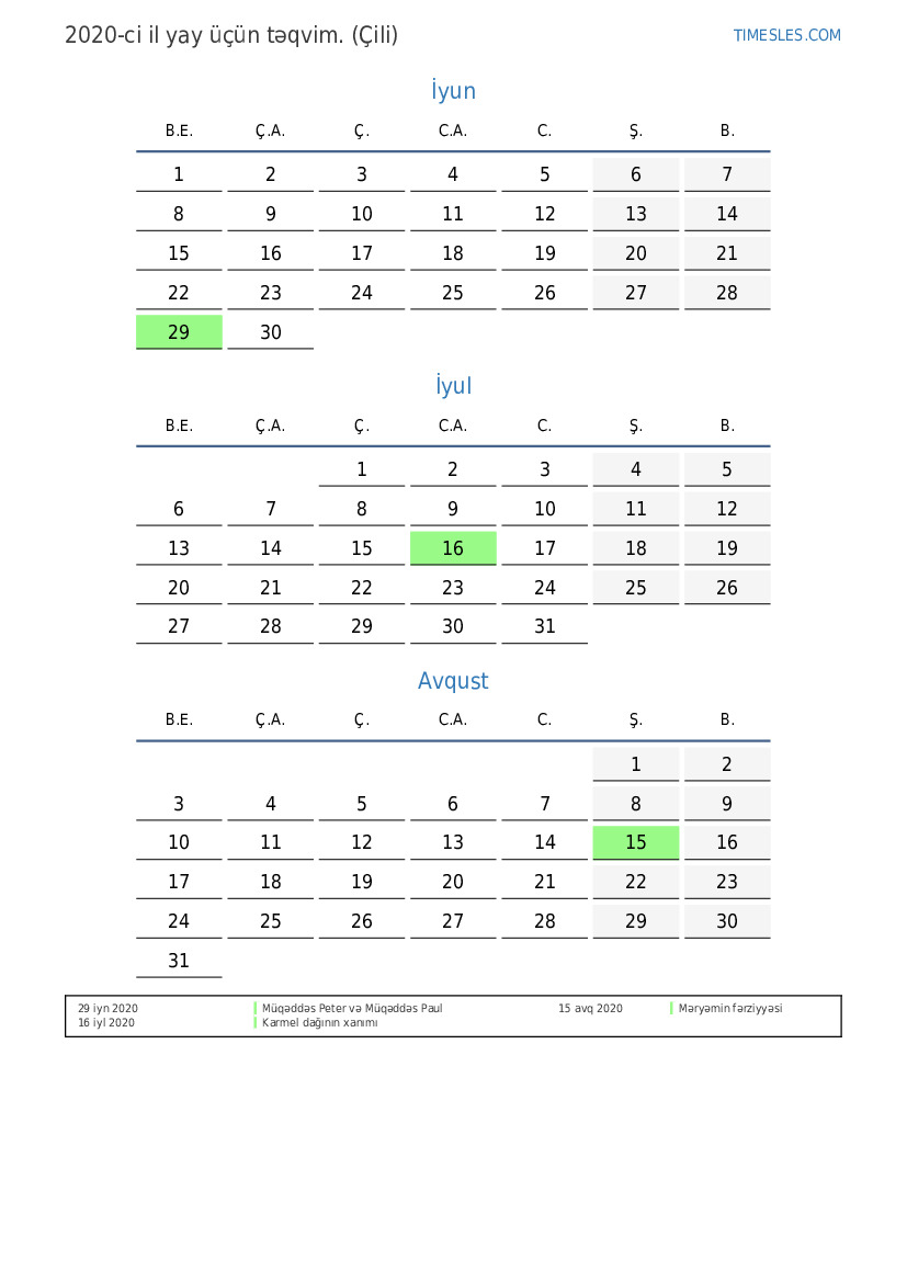 2020-ci ilin Yayda Çilidə 5 tətil və istirahət günləri var. Yay 2020 bazar ertəsi başlayır və bazar ertəsi günü bitir.