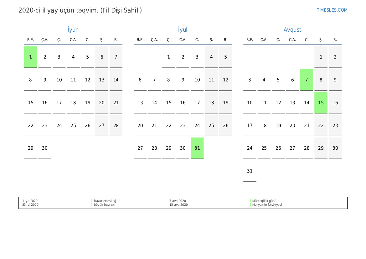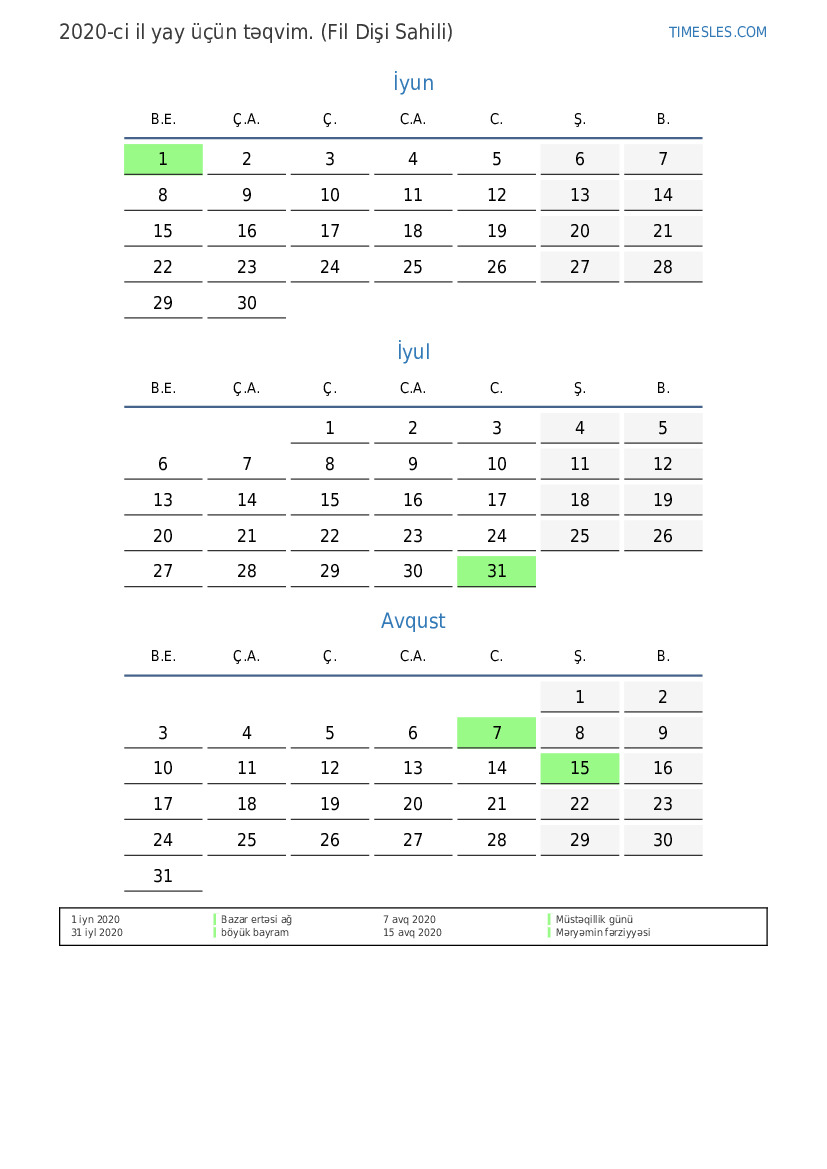 Fil Dişi Sahili üçün 2020-ci ilin yay üçün tətil və həftə sonları ilə PDF təqvimini yükləyin və çap edin