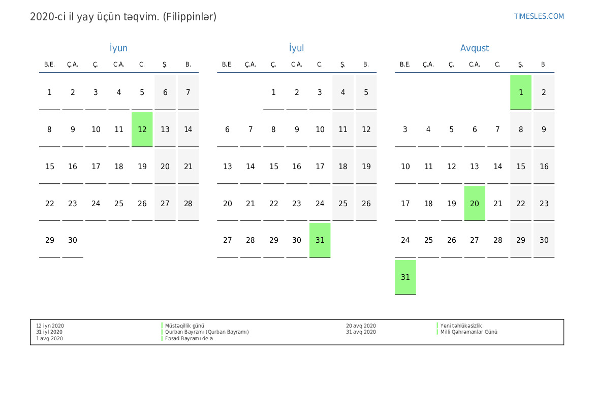 Filippinlər üçün 2020-ci ilin yay üçün tətil və həftə sonları ilə PDF təqvimini yükləyin və çap edin