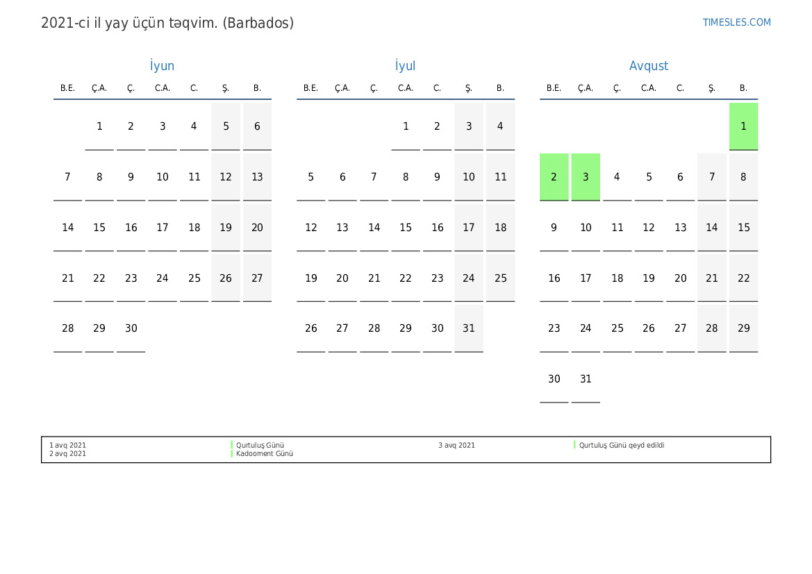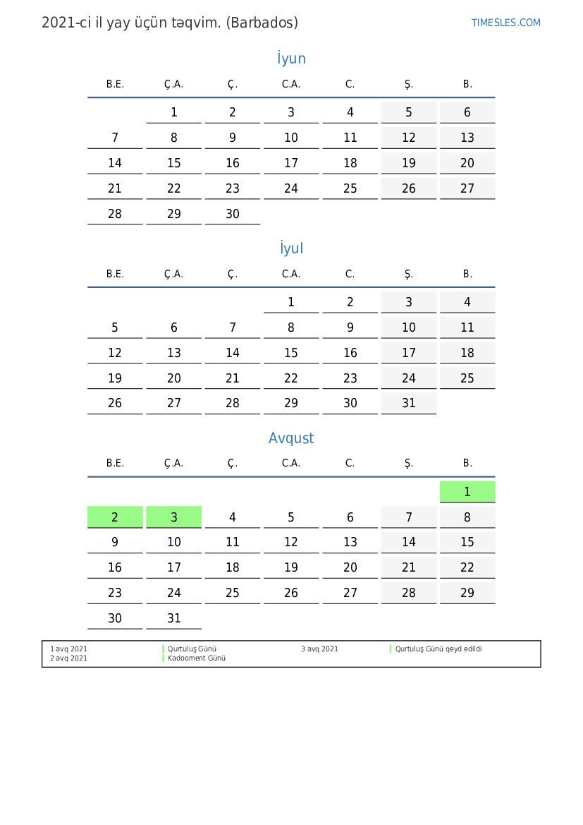 Barbados üçün 2021-ci ilin yay üçün tətil və həftə sonları təqvimi
