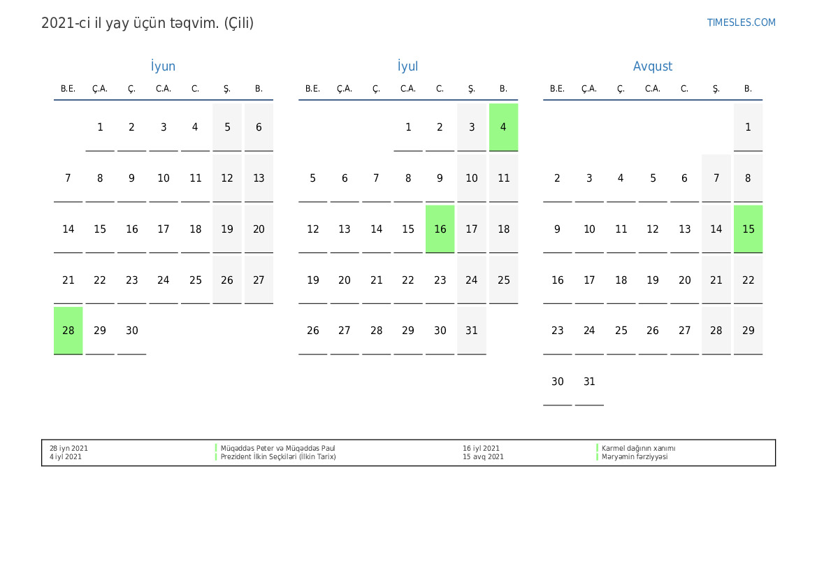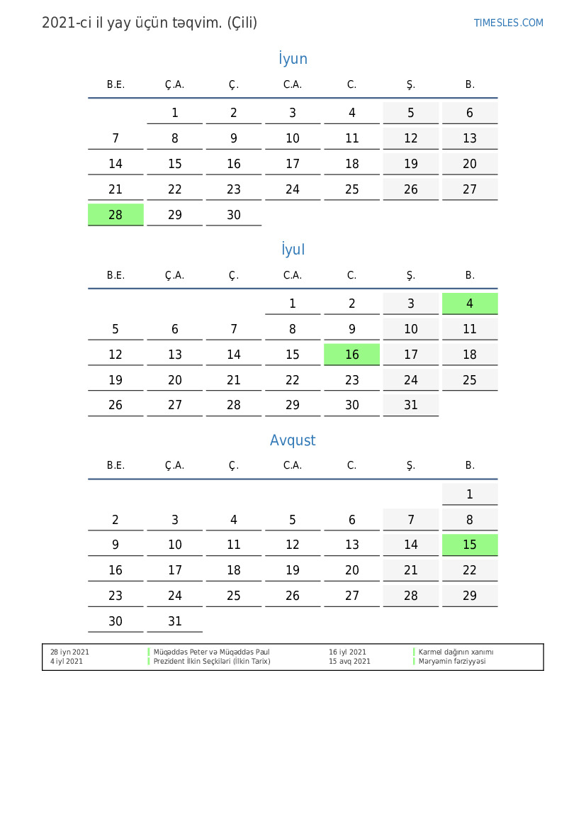 Çili üçün 2021-ci ilin yay üçün tətil və həftə sonları ilə PDF təqvimini yükləyin və çap edin