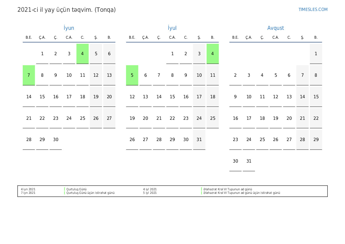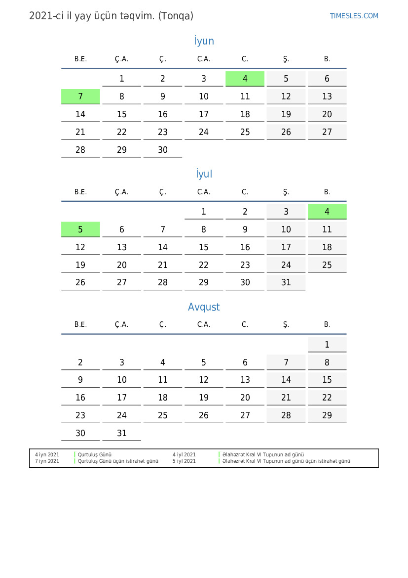 Tonqa üçün 2021-ci ilin yay üçün tətil və həftə sonları ilə PDF təqvimini yükləyin və çap edin