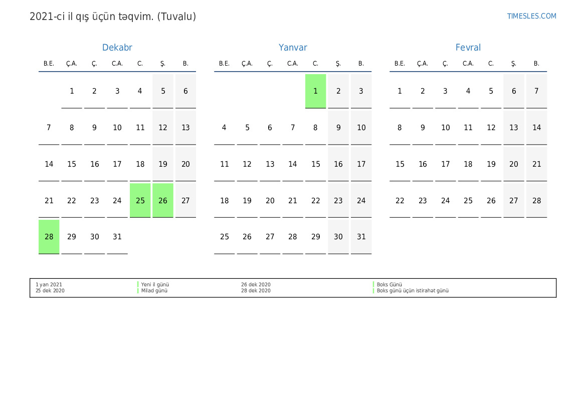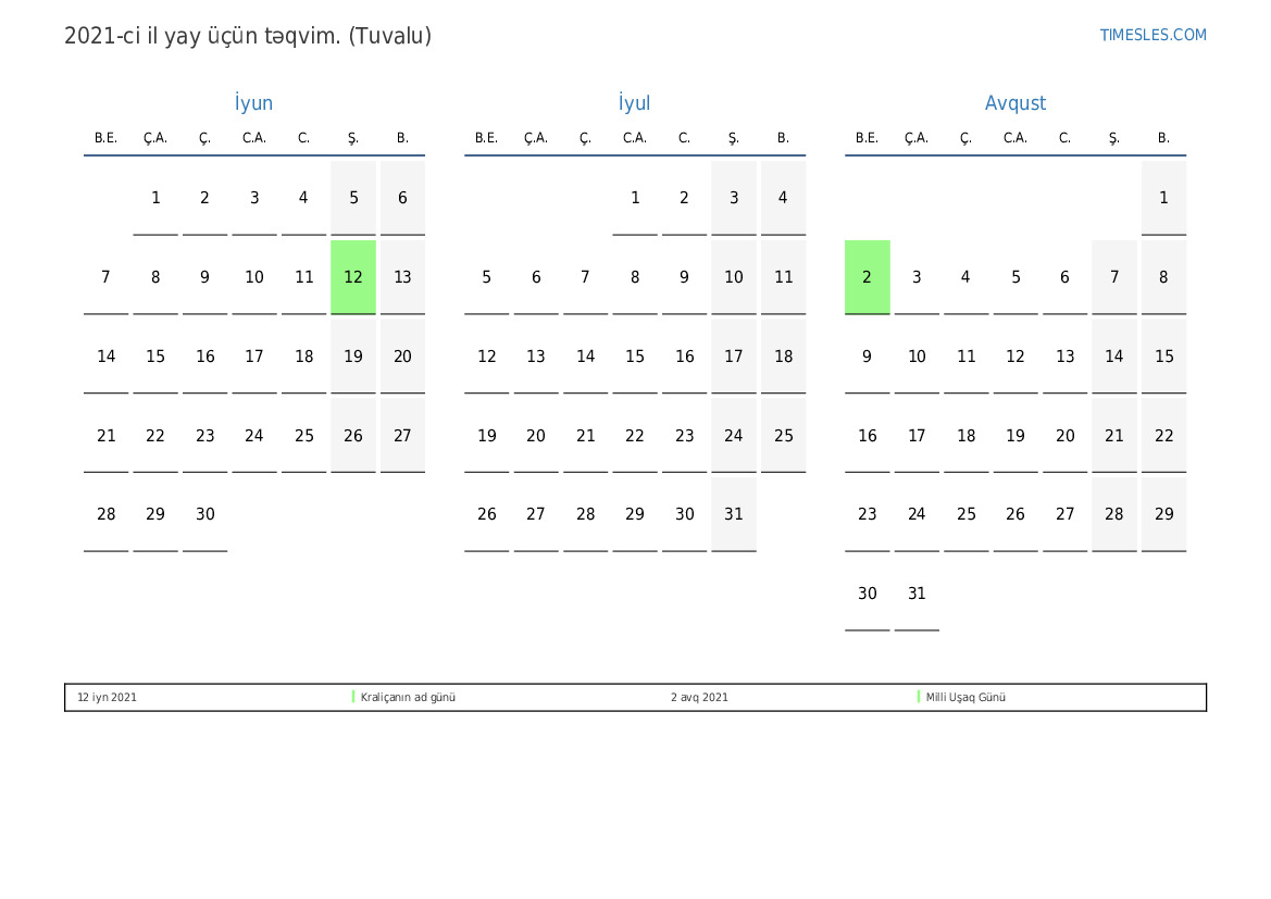 Tuvalu üçün 2021-ci ilin yay üçün tətil və həftə sonları təqvimi