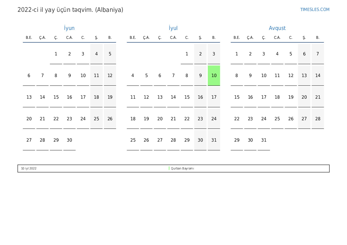 Albaniya üçün 2022-ci il yay üçün təqvim