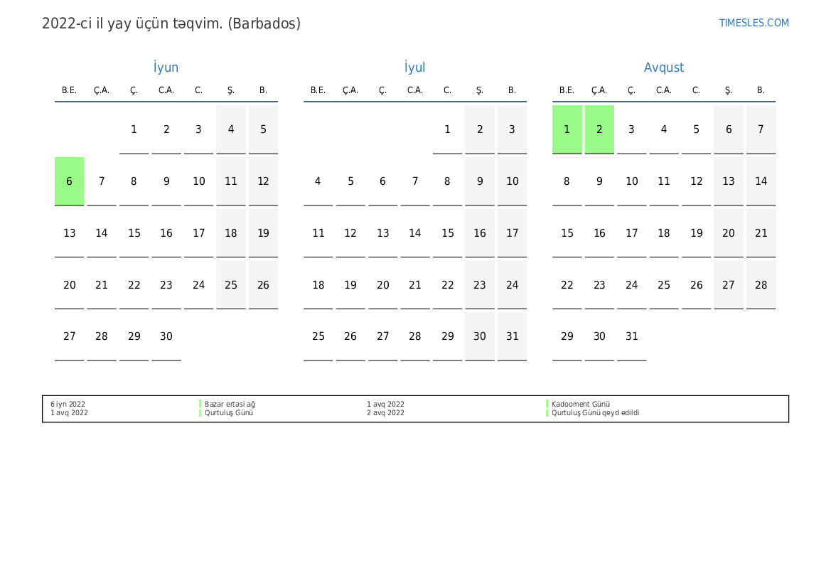 Barbados üçün 2022-ci ilin yay üçün tətil və həftə sonları təqvimi