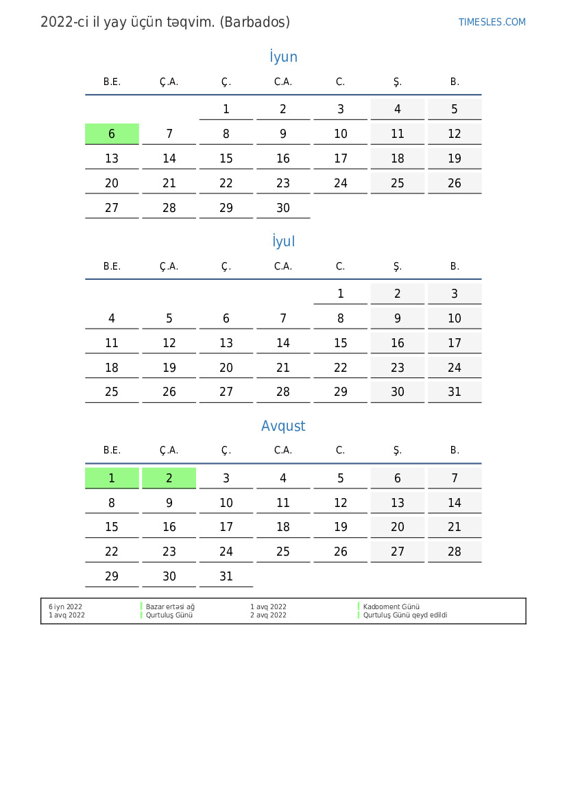 Barbados üçün 2022-ci ilin yay üçün tətil və həftə sonları ilə PDF təqvimini yükləyin və çap edin