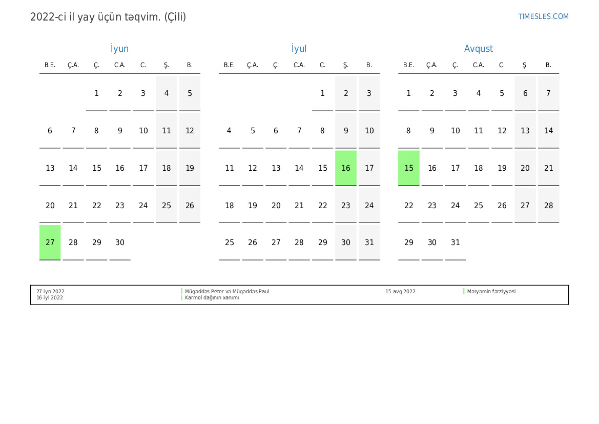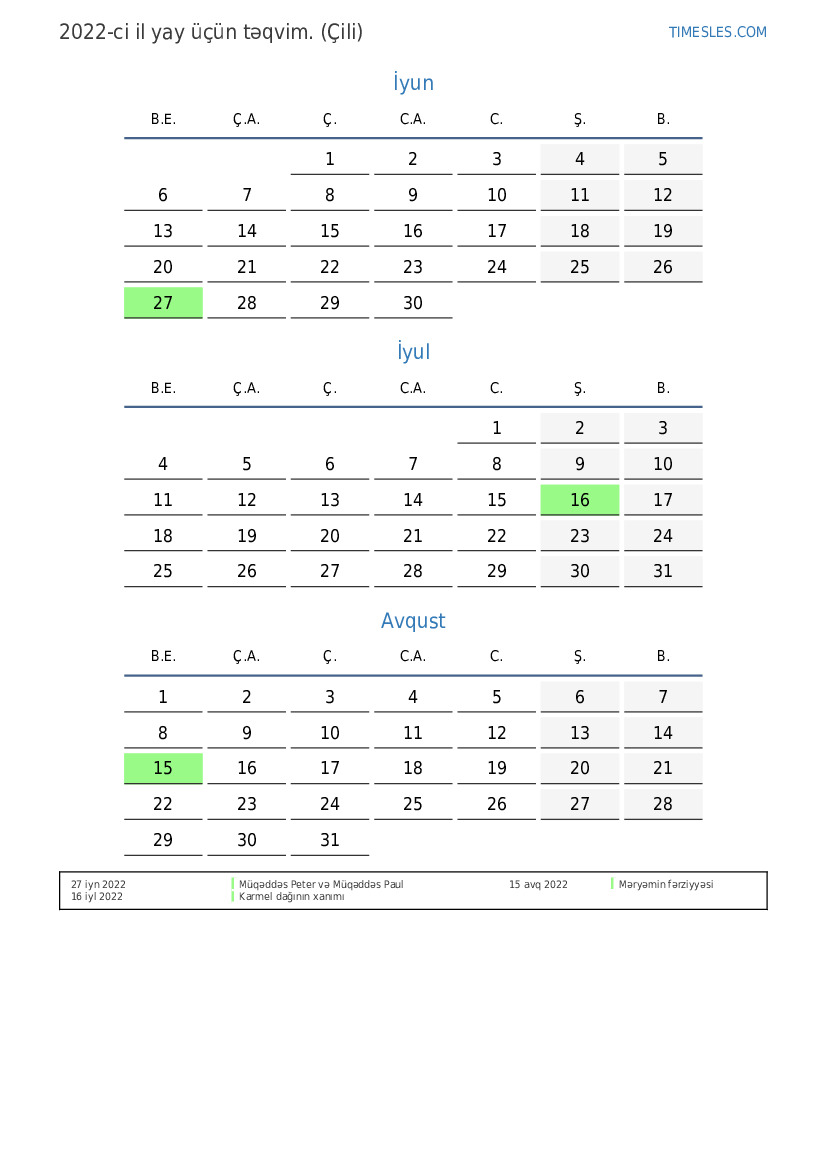 Çili üçün 2022-ci ilin yay üçün tətil və həftə sonları ilə PDF təqvimini yükləyin və çap edin
