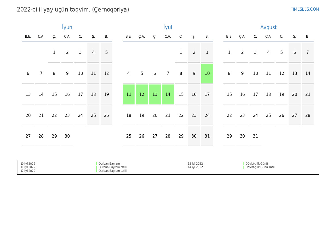 Montenegro üçün 2022-ci il yay üçün təqvim
