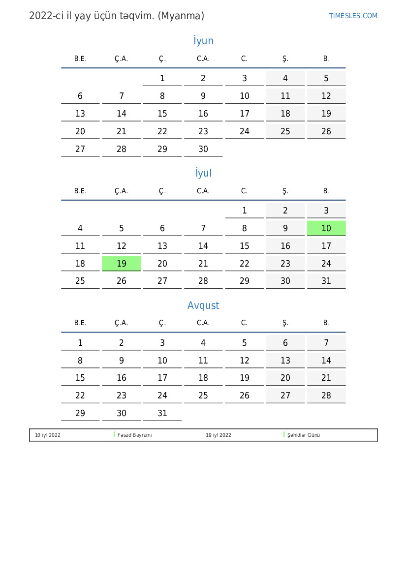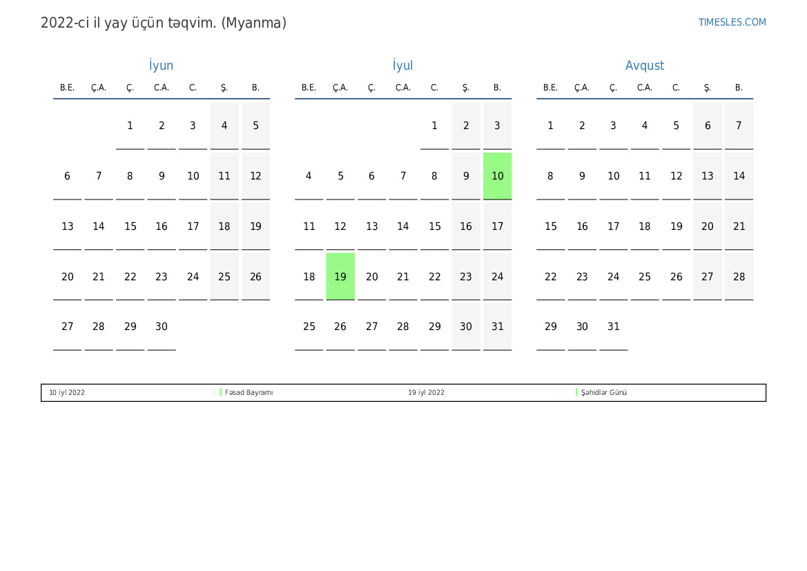 Myanmar üçün 2022-ci il yay üçün təqvim