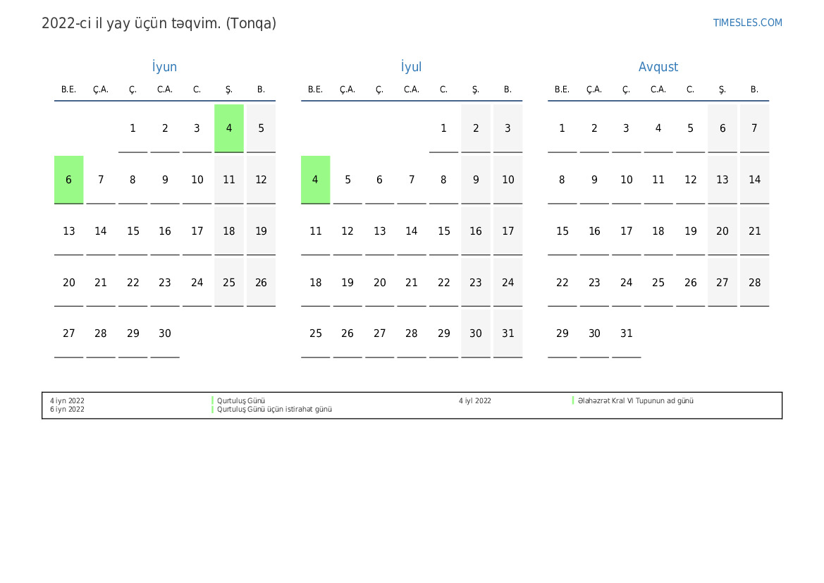 Tonqa üçün 2022-ci ilin yay üçün tətil və həftə sonları təqvimi