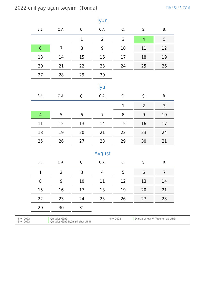 Tonqa üçün 2022-ci ilin yay üçün tətil və həftə sonları ilə PDF təqvimini yükləyin və çap edin