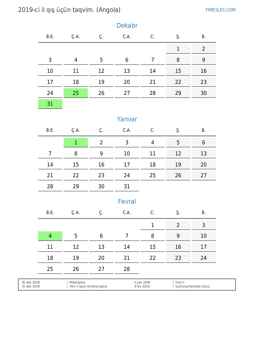 Angola üçün 2019-ci ilin qış üçün tətil və həftə sonları ilə PDF təqvimini yükləyin və çap edin