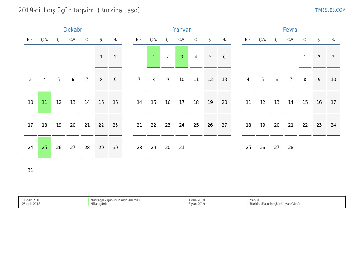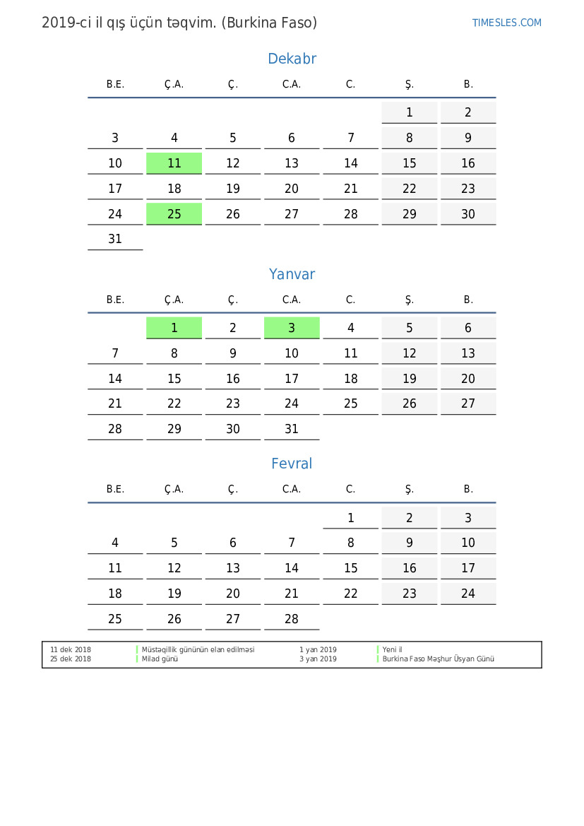 Burkina Faso üçün 2019-ci ilin qış üçün tətil və həftə sonları ilə PDF təqvimini yükləyin və çap edin
