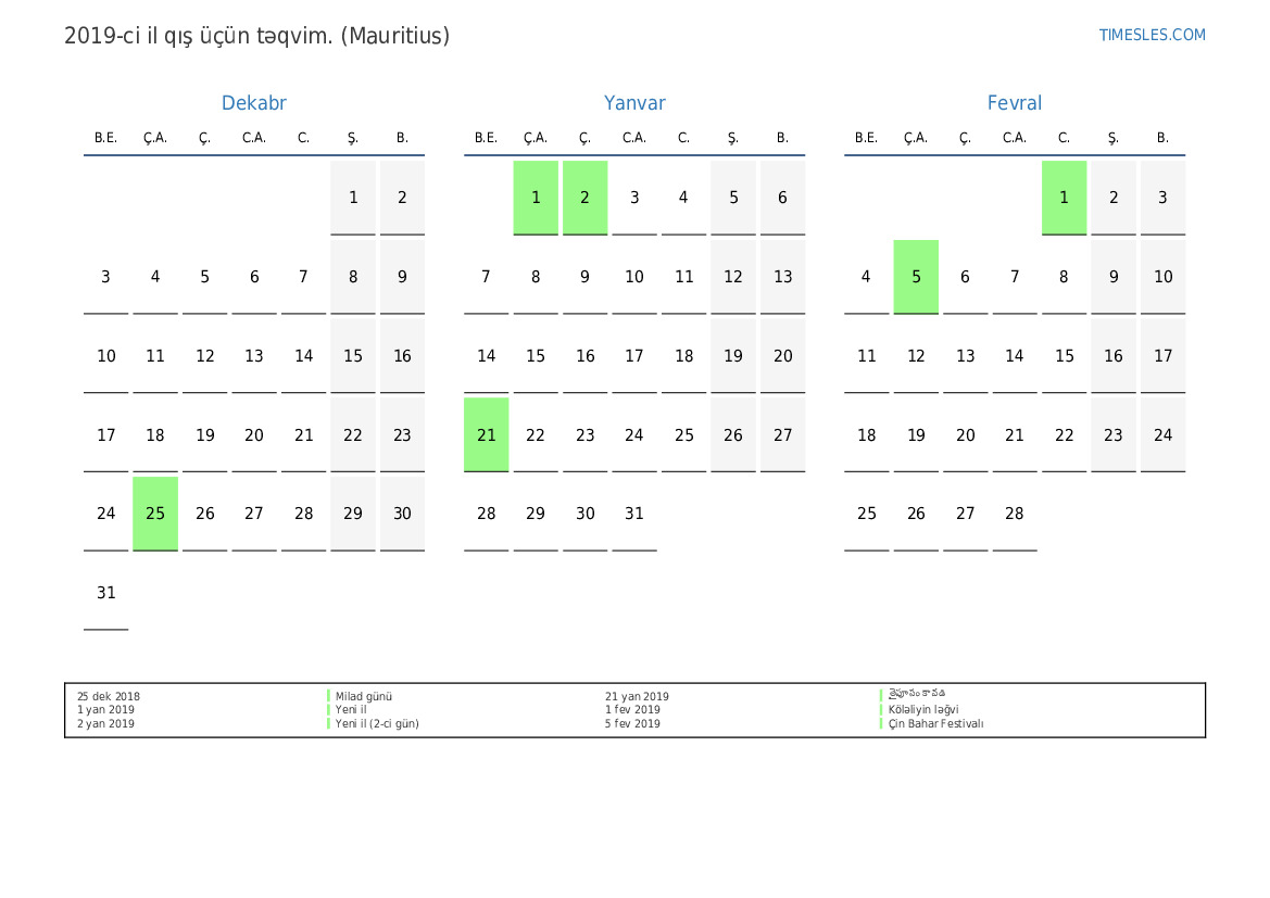 Mauritius üçün 2019-ci il qış üçün təqvim