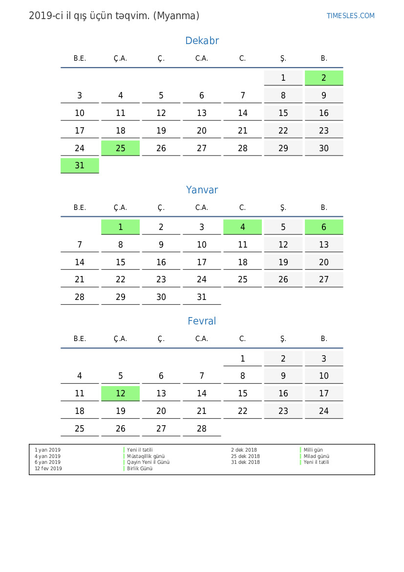 Myanmar üçün 2019-ci ilin qış üçün tətil və həftə sonları ilə PDF təqvimini yükləyin və çap edin