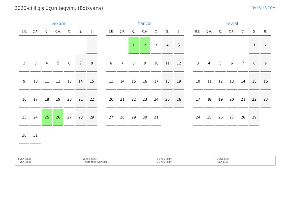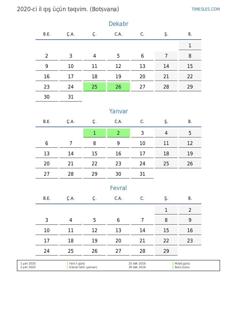 Botsvana üçün 2020-ci il qış üçün təqvim