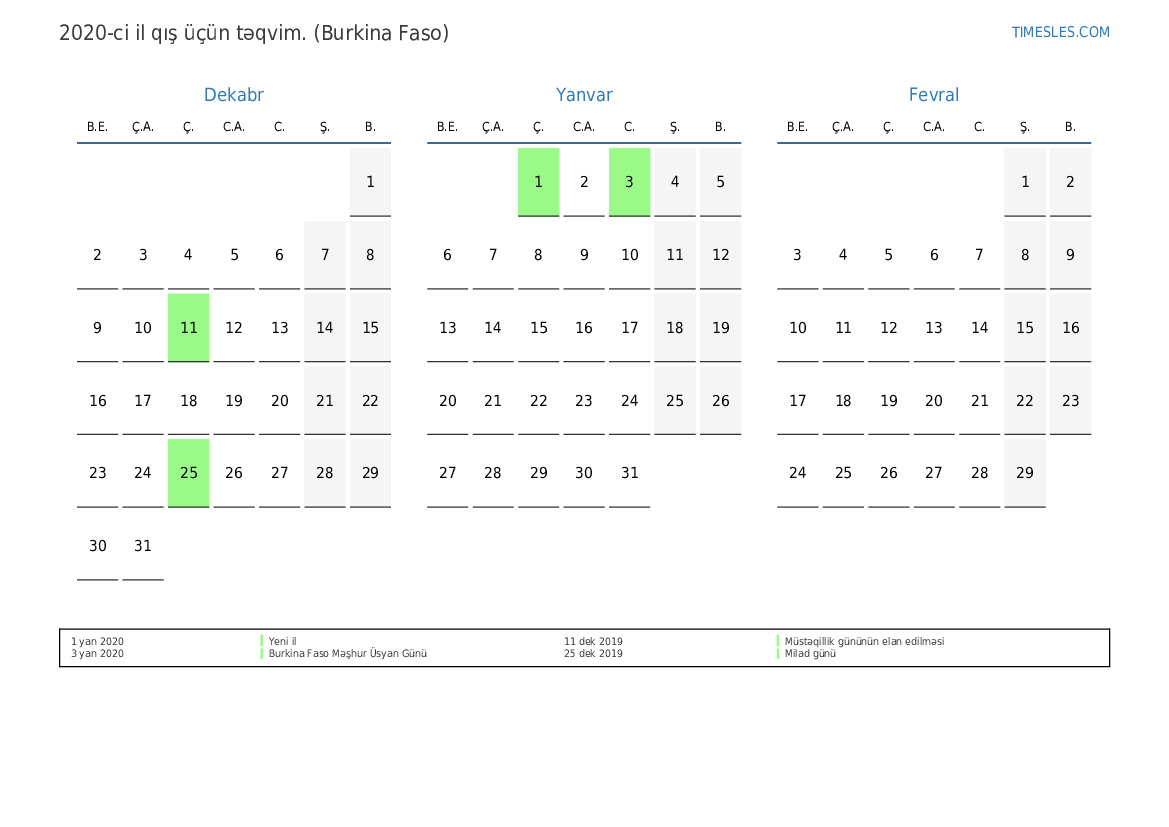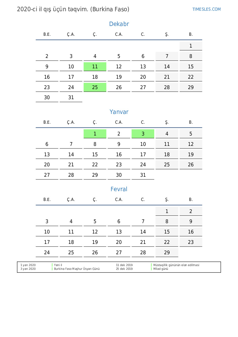 Burkina Faso üçün 2020-ci ilin qış üçün tətil və həftə sonları ilə PDF təqvimini yükləyin və çap edin