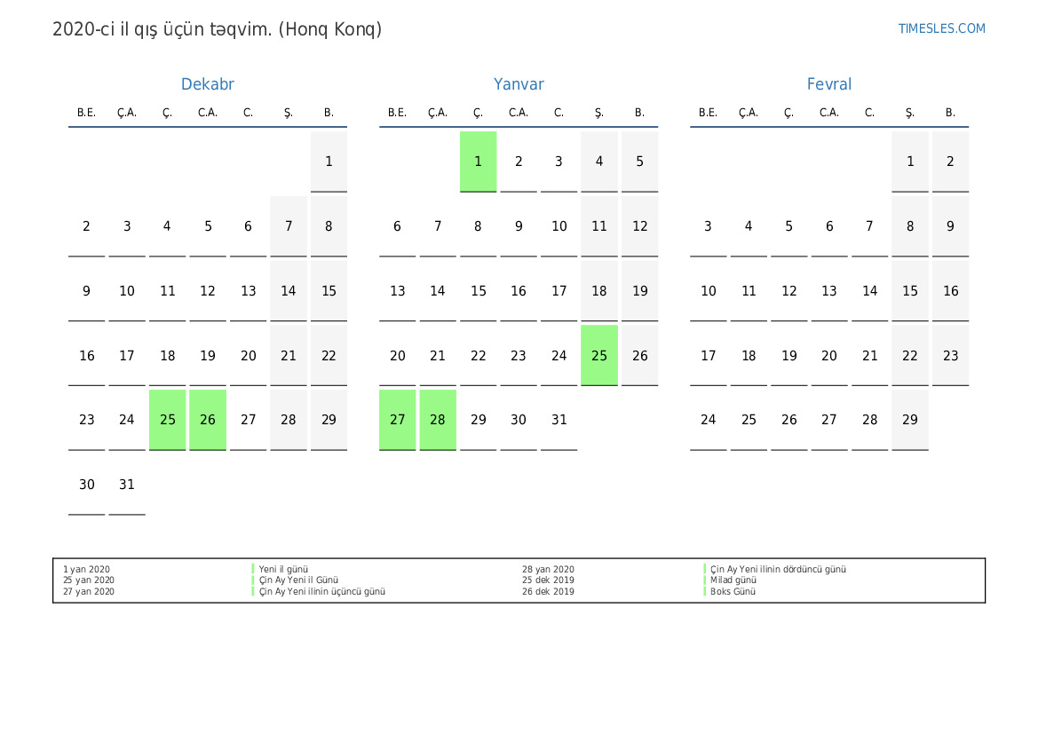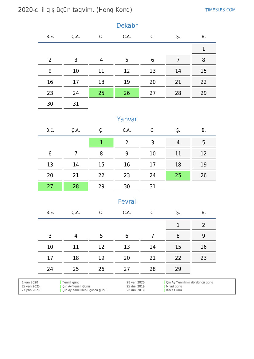 Hong Kong üçün 2020-ci ilin qış üçün tətil və həftə sonları ilə PDF təqvimini yükləyin və çap edin