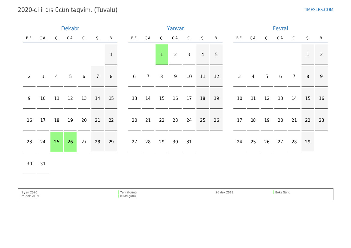 Tuvalu üçün 2020-ci il qış üçün təqvim