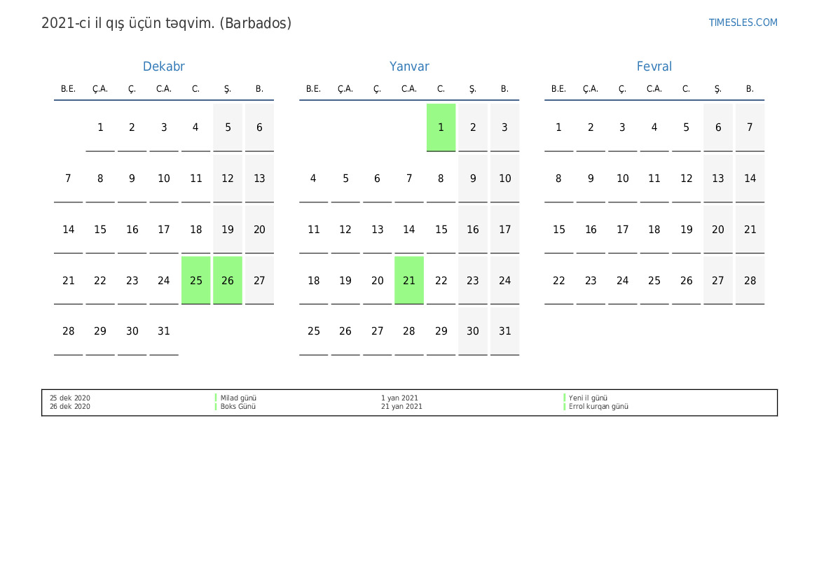 Barbados üçün 2021-ci il qış üçün təqvim