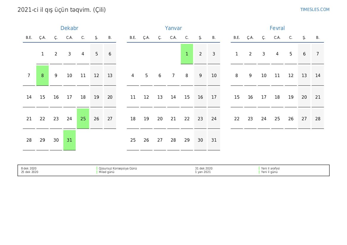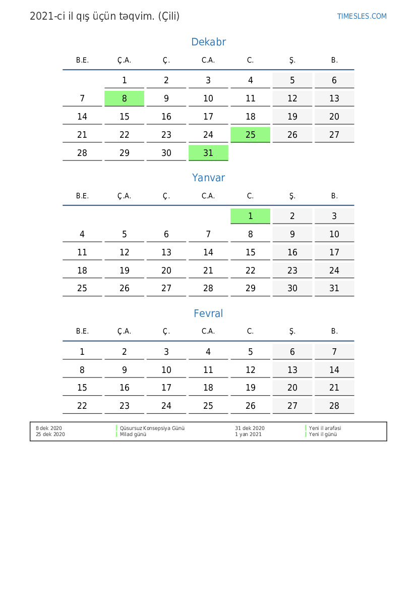 Çili üçün 2021-ci ilin qış üçün tətil və həftə sonları ilə PDF təqvimini yükləyin və çap edin