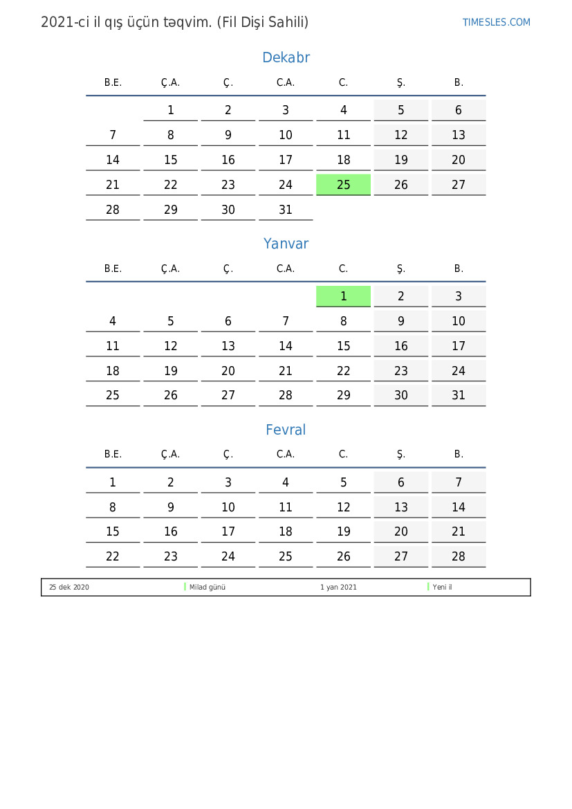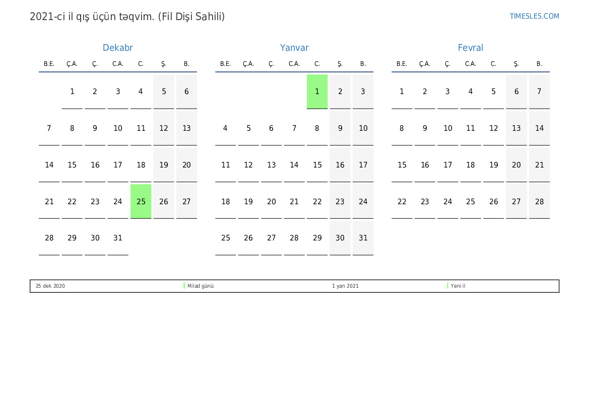 Fil Dişi Sahili üçün 2021-ci ilin qış üçün tətil və həftə sonları ilə PDF təqvimini yükləyin və çap edin
