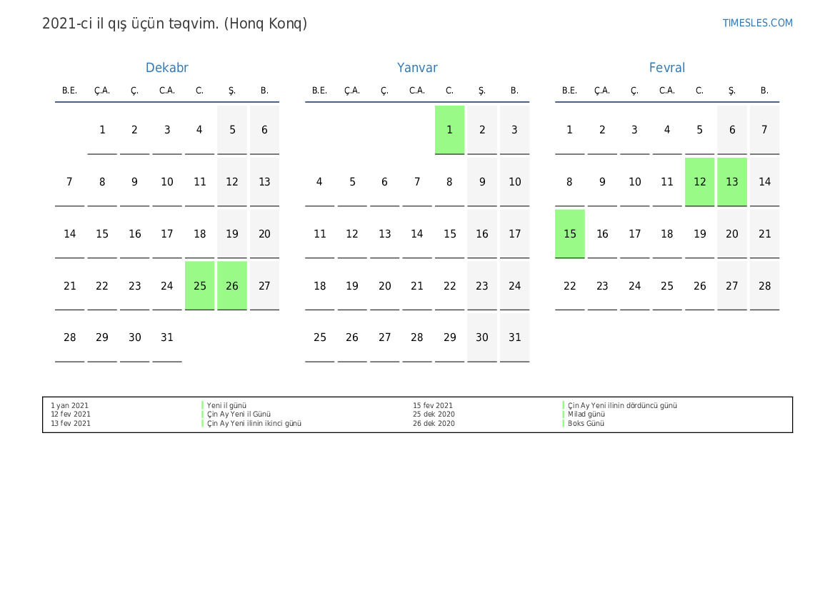 Hong Kong üçün 2021-ci ilin qış üçün tətil və həftə sonları ilə PDF təqvimini yükləyin və çap edin