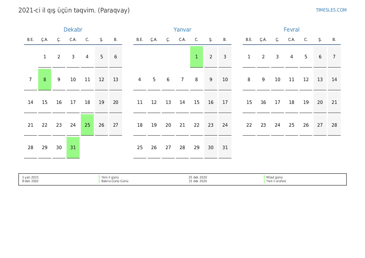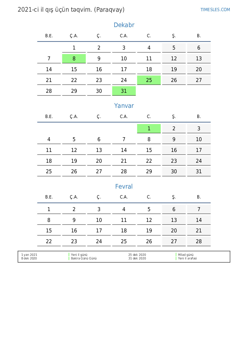 Paraqvay üçün 2021-ci ilin qış üçün tətil və həftə sonları ilə PDF təqvimini yükləyin və çap edin