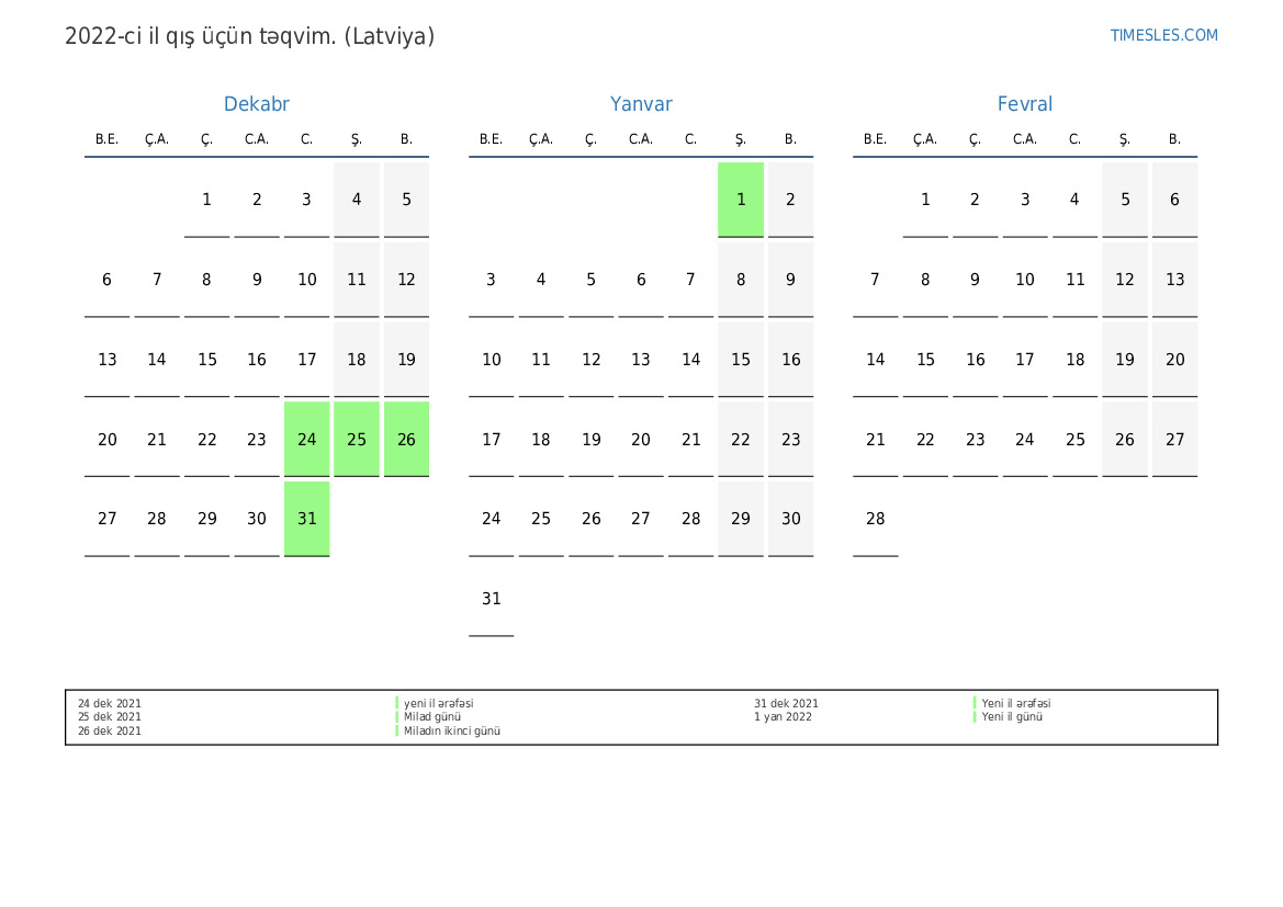 Latviya üçün 2022-ci ilin qış üçün tətil və həftə sonları ilə PDF təqvimini yükləyin və çap edin