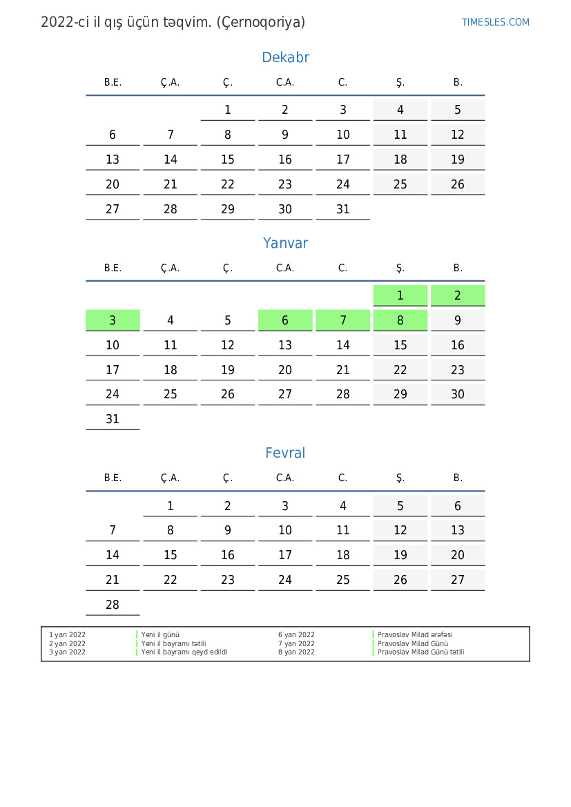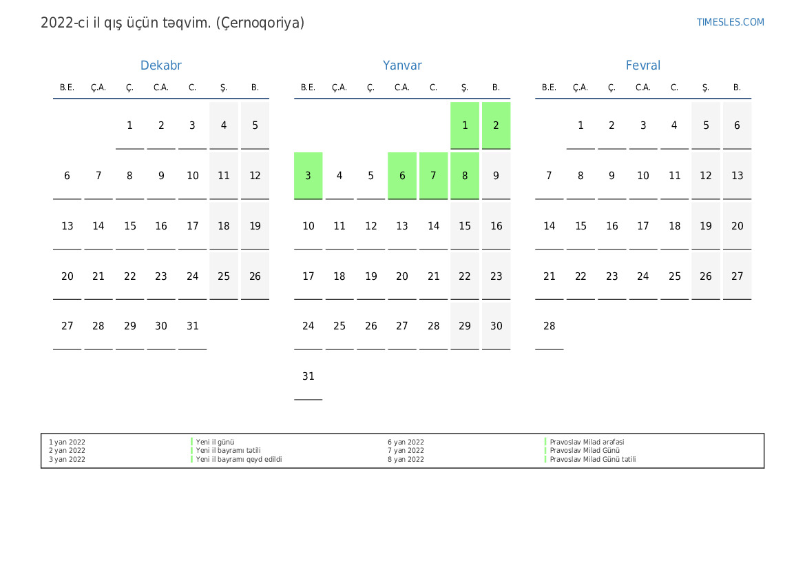 Montenegro üçün 2022-ci ilin qış üçün tətil və həftə sonları ilə PDF təqvimini yükləyin və çap edin