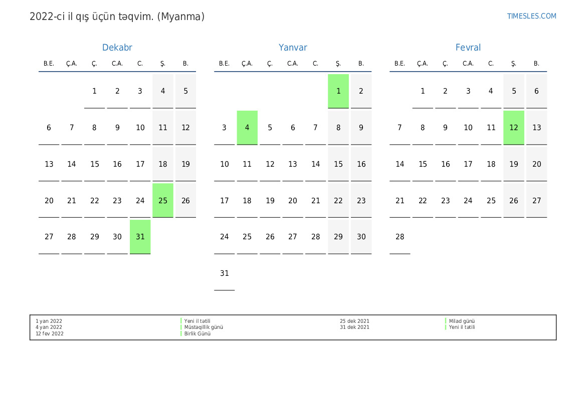 Myanmar üçün 2022-ci ilin qış üçün tətil və həftə sonları ilə PDF təqvimini yükləyin və çap edin