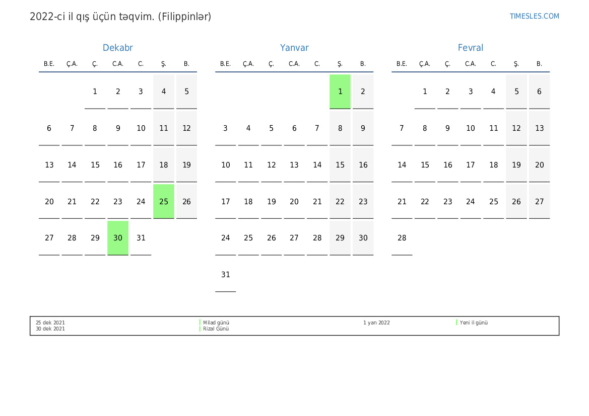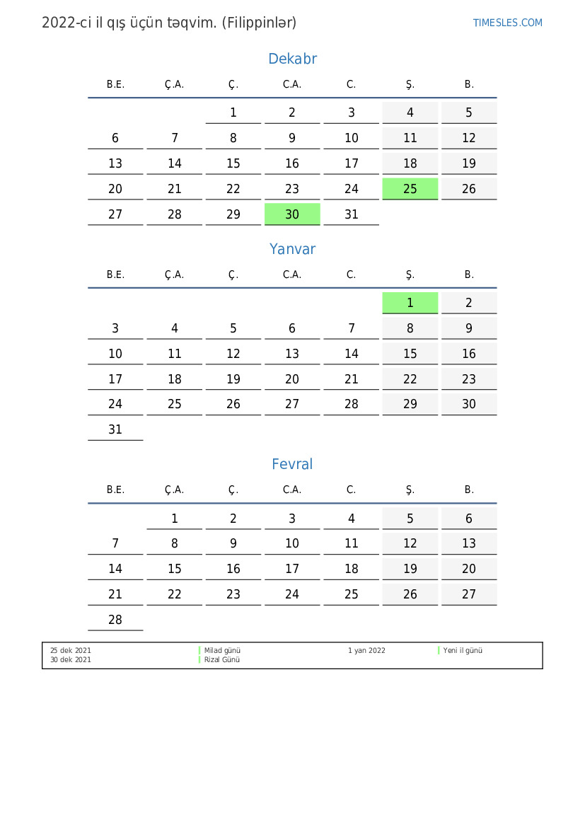 Filippinlər üçün 2022-ci ilin qış üçün tətil və həftə sonları ilə PDF təqvimini yükləyin və çap edin