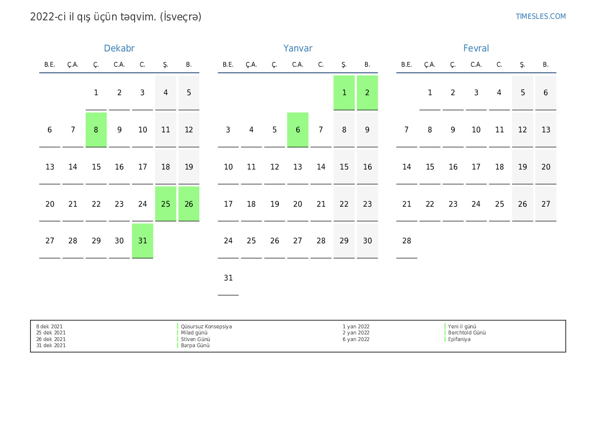 İsveçrə üçün 2022-ci ilin qış üçün tətil və həftə sonları təqvimi