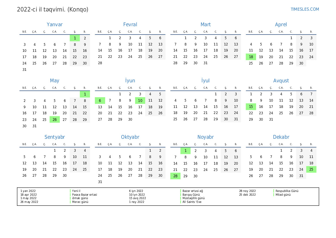 Konqo üçün 2022-ci il üçün tətil və həftə sonları ilə PDF təqvimini yükləyin və çap edin