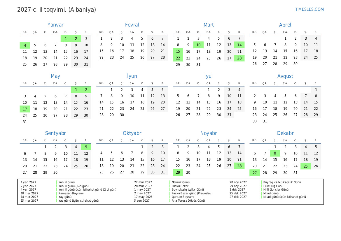 15 mar 2027 Yaz günü üçün istirahət günü