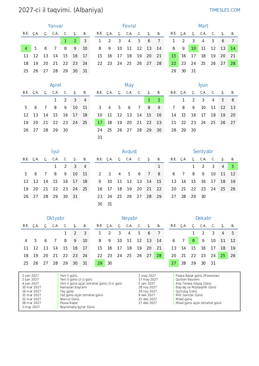 4 yan 2027 Yeni il günü üçün istirahət günü (2-ci gün)