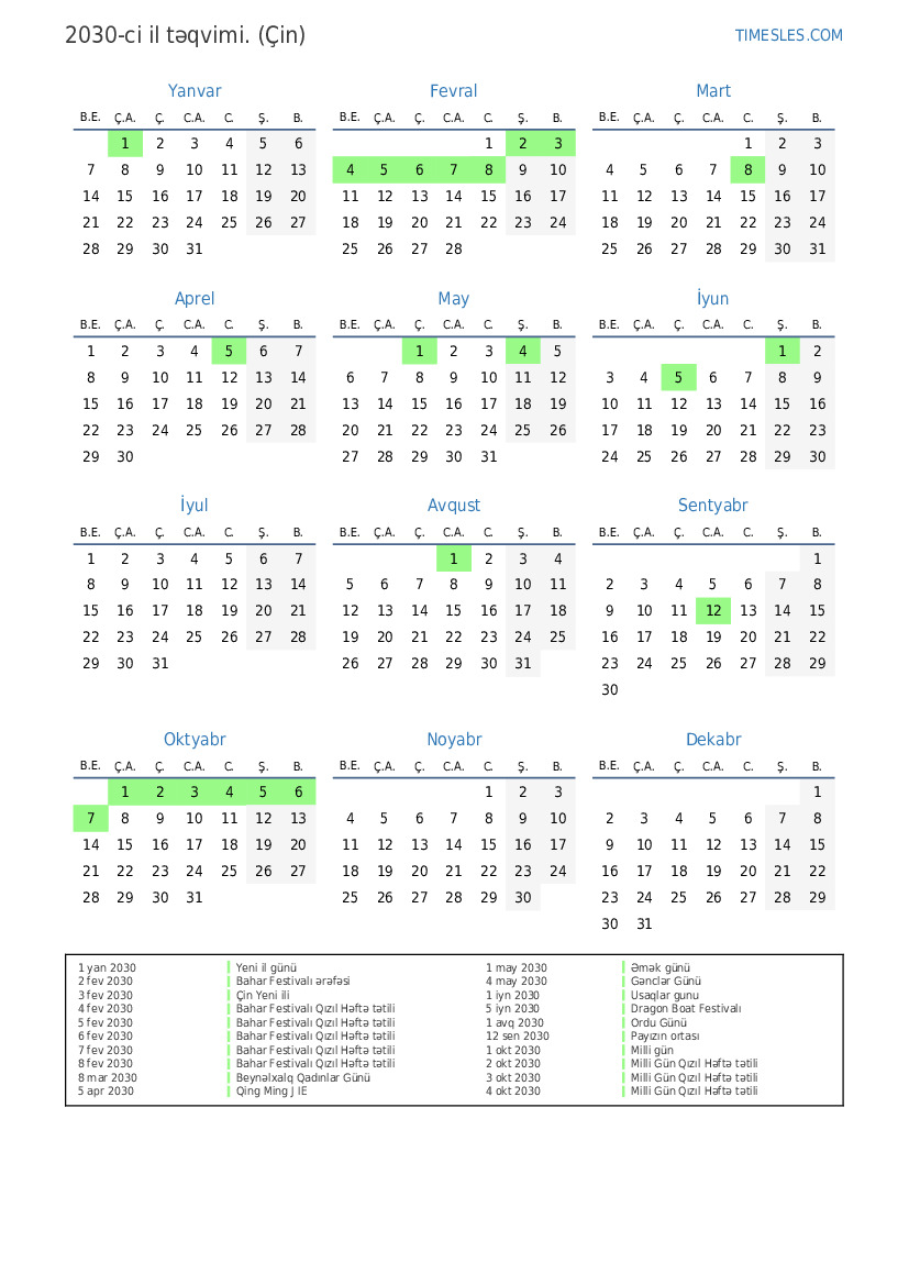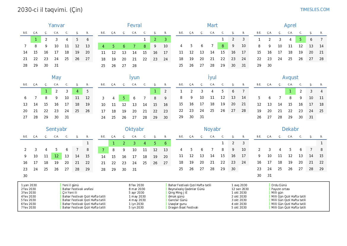 5 fev 2030 Bahar Festivalı Qızıl Həftə tətili
