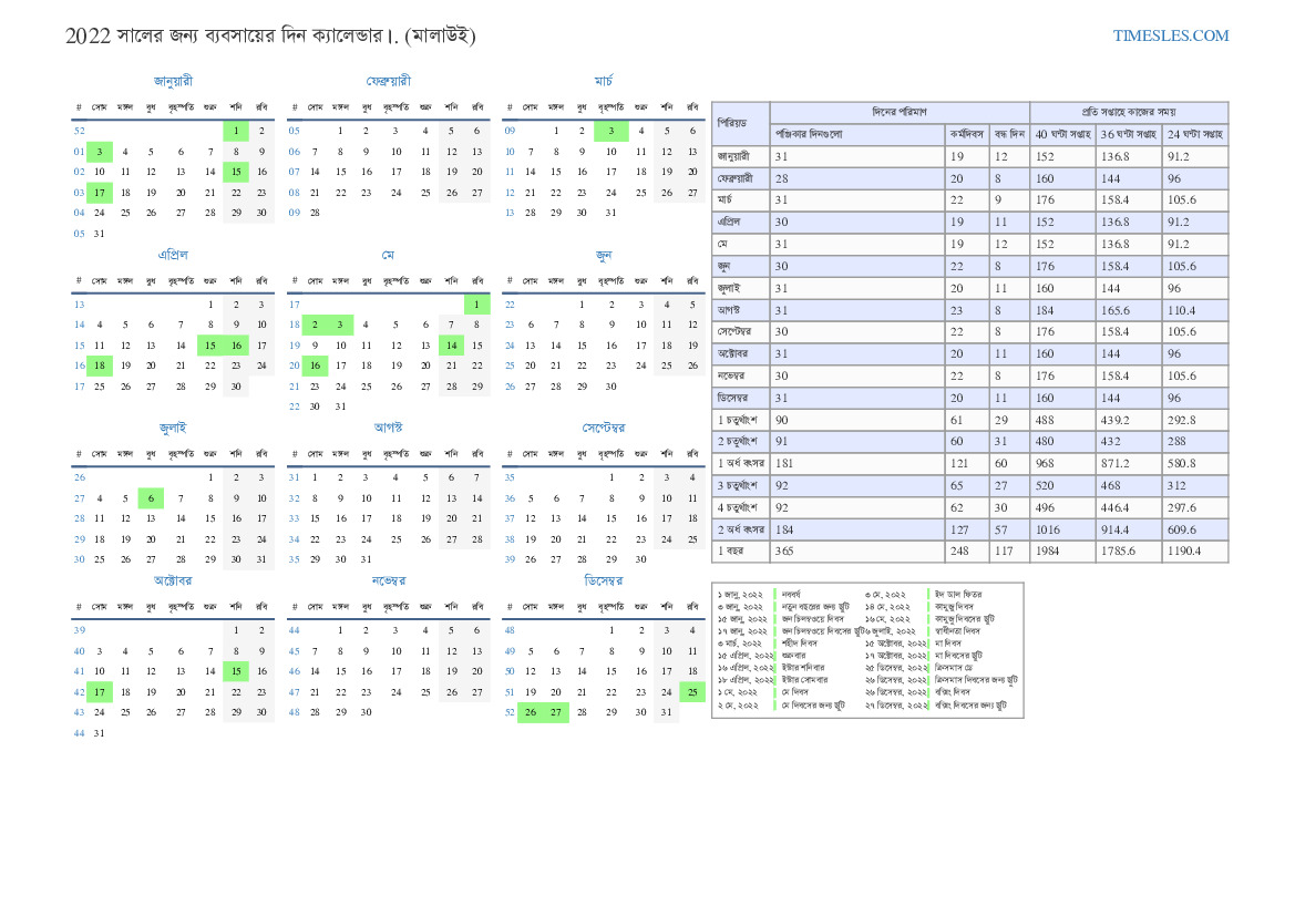 মালাউয়ের পক্ষে 2022 আগস্ট ব্যবসায়িক দিন ক্যালেন্ডার