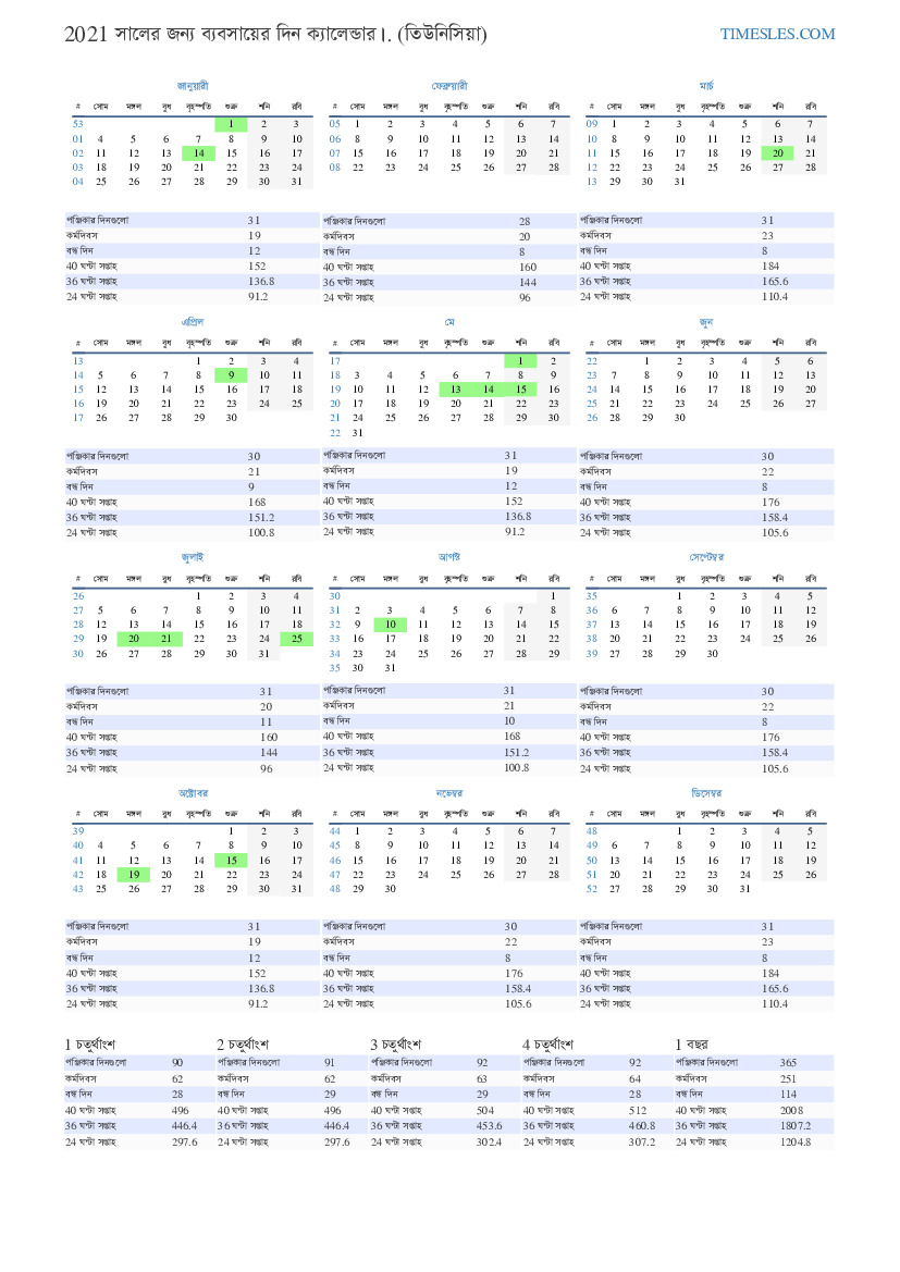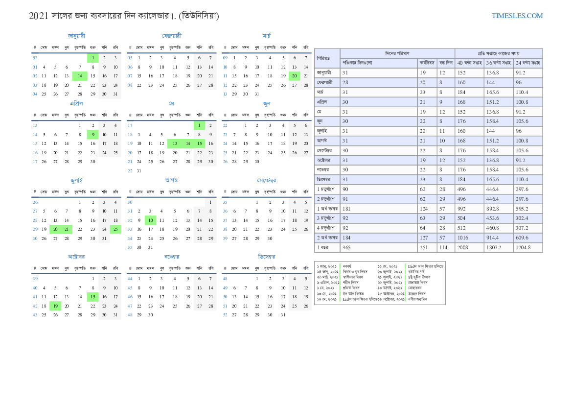 2021 এর 2 ত্রৈমাসিকের তিউনিসিয়ার জন্য ছুটি এবং সাপ্তাহিক ছুটির দিন সহ ব্যবসায়িক দিন ক্যালেন্ডার