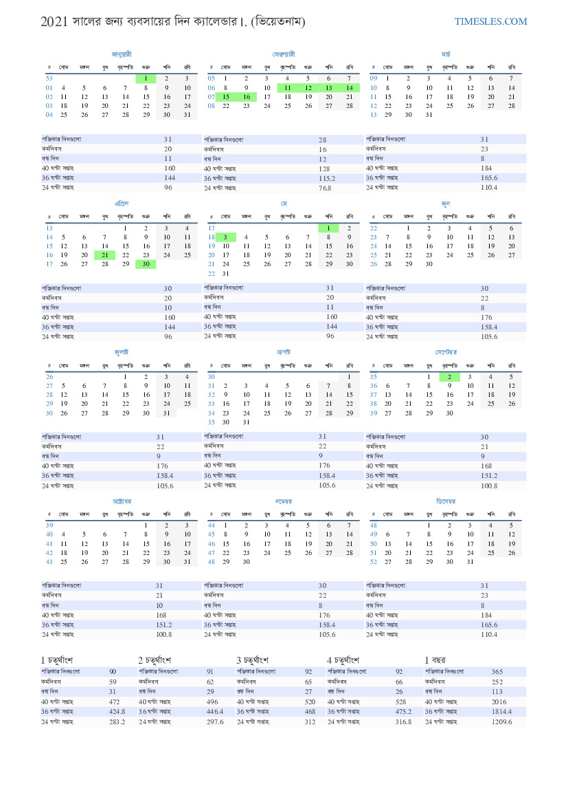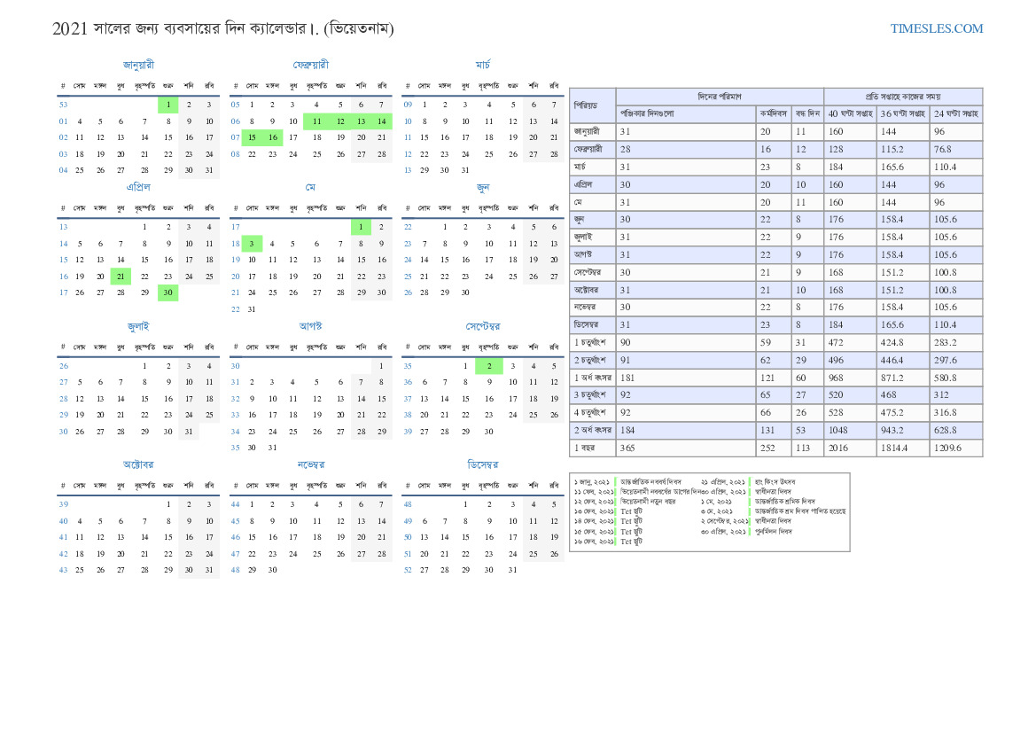 2021 এর 2 ত্রৈমাসিকের ভিয়েতনামের জন্য ছুটি এবং সাপ্তাহিক ছুটির দিন সহ ব্যবসায়িক দিন ক্যালেন্ডার
