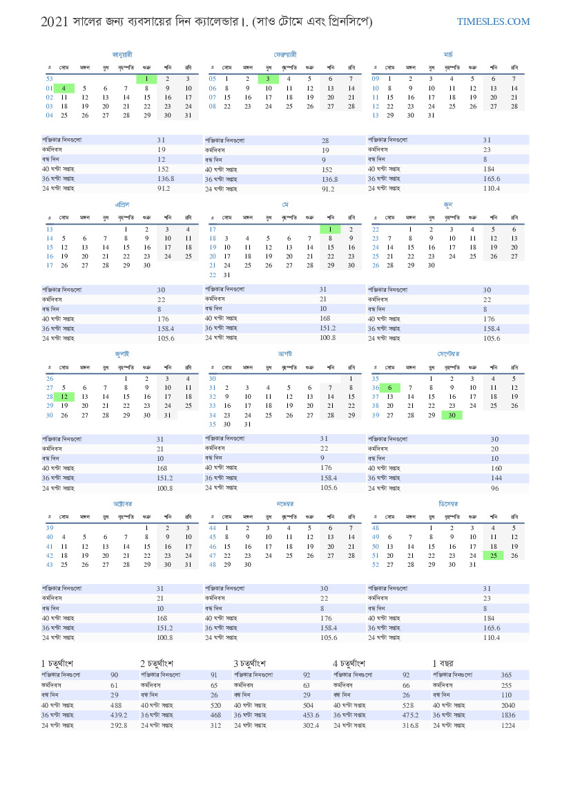 ব্যবসায়ের দিন ক্যালেন্ডার