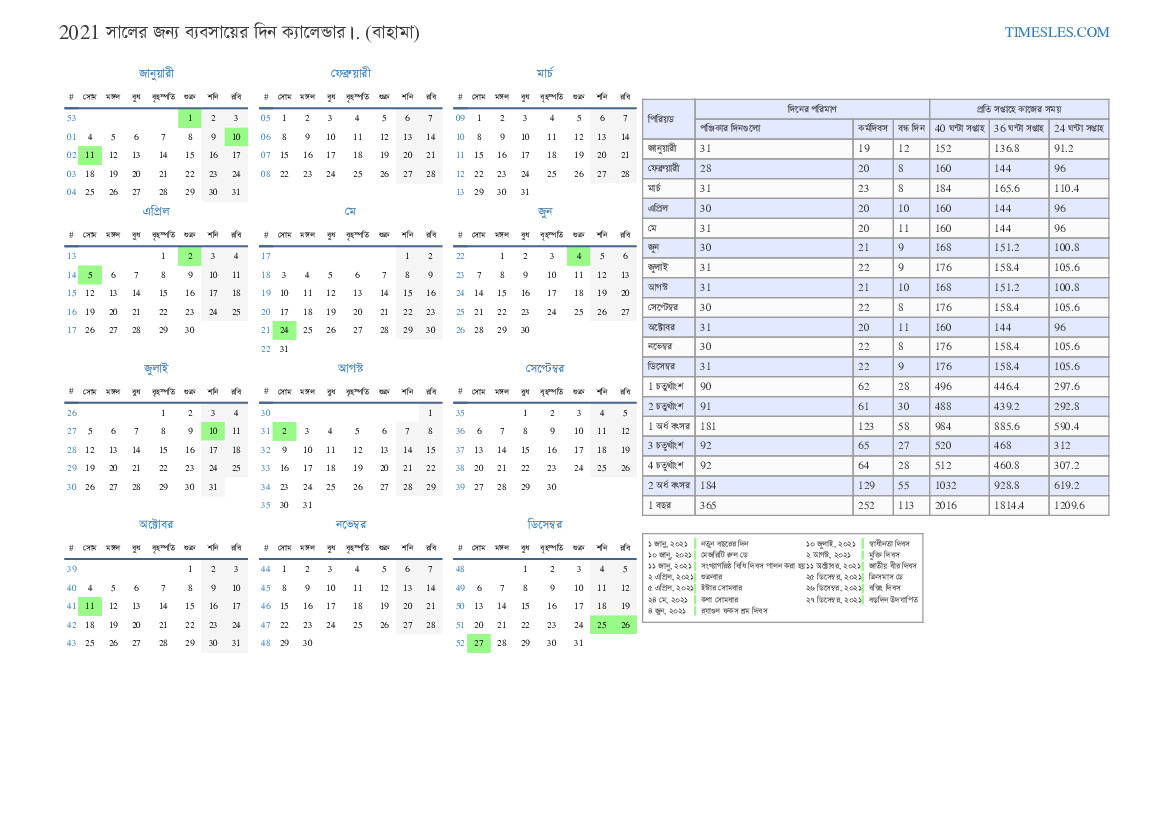 2021 এর 3 ত্রৈমাসিকের বাহামা জন্য ছুটি এবং সাপ্তাহিক ছুটির দিন সহ ব্যবসায়িক দিন ক্যালেন্ডার