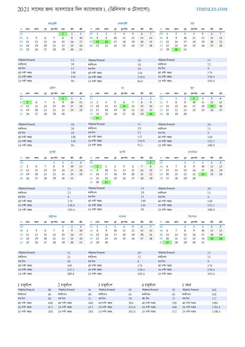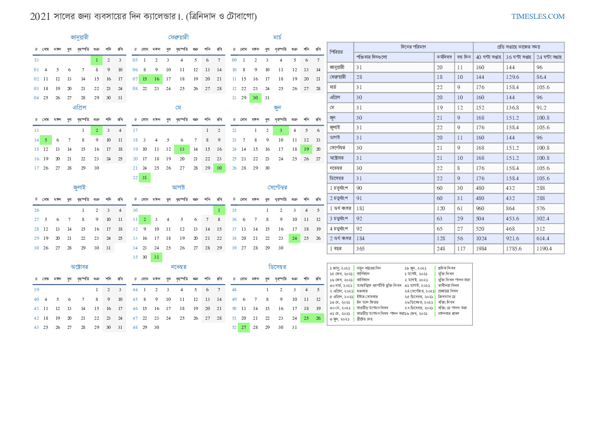 2021 এর 4 ত্রৈমাসিকের ত্রিনিদাদ ও টোবাগো এর জন্য ছুটি এবং সাপ্তাহিক ছুটির দিন সহ ব্যবসায়িক দিন ক্যালেন্ডার